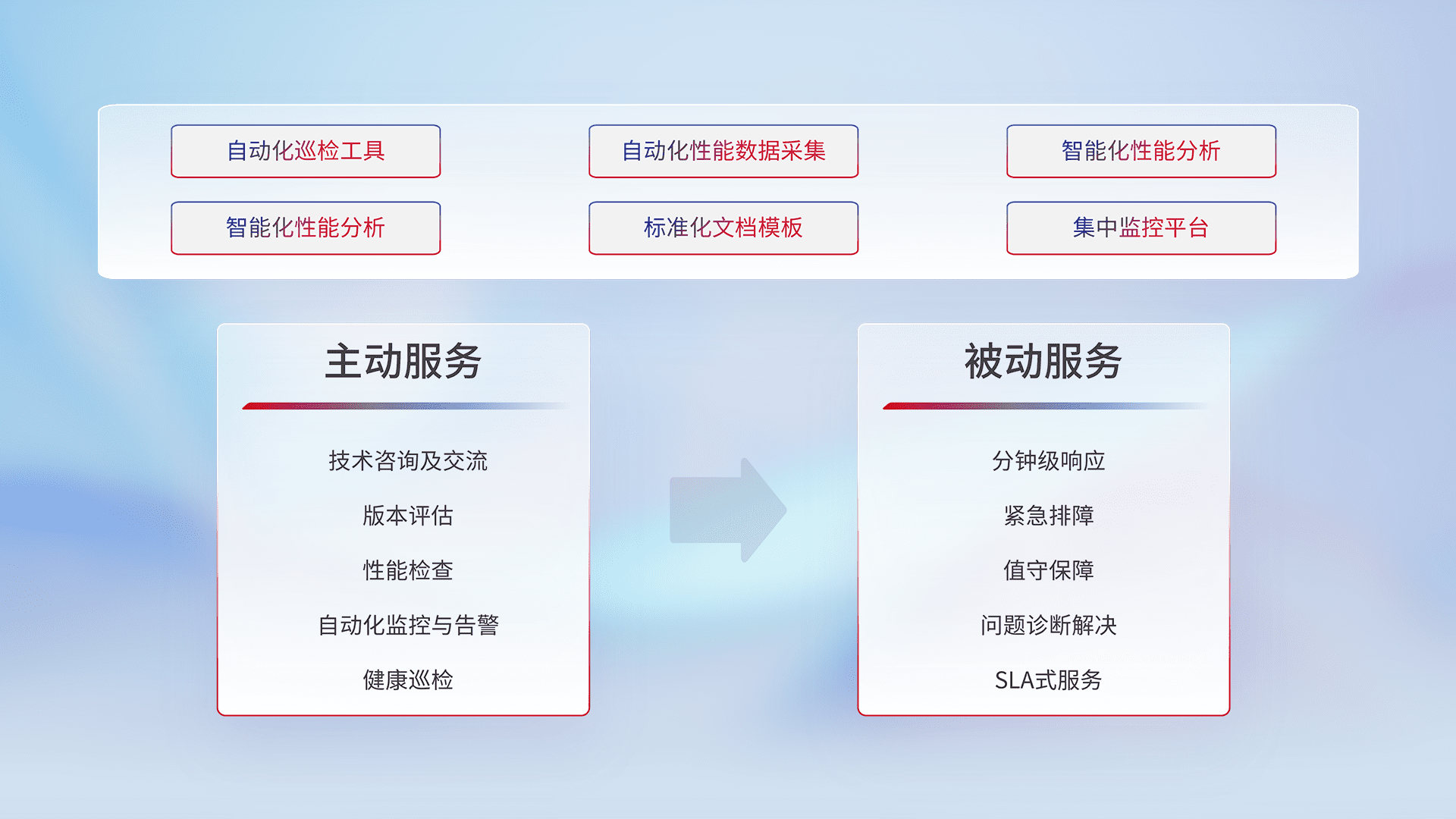 智能化工具和标准化文档,,,,保障服务质量,,,,提供主动服务(包含技术咨询、、、、版本评估、、、性能检查、、、自动化监控与告警、、、健康巡检)和被动服务包含(分钟级响应、、、紧急排障、、、值守保障、、、、问题诊断解决、、、SLA服务)。。。