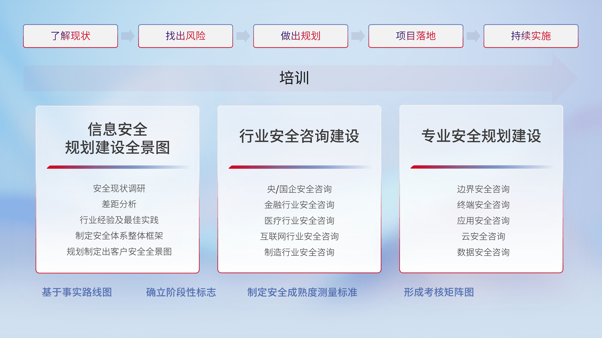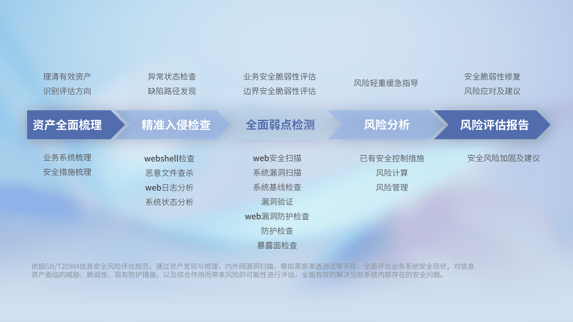 针对客户行业特性,,以专业的安全服务+多厂商联合解决方案提供专属的一站式安全管理服务,,,,帮助客户全面感知网络空间威胁,,基于识别、、、检测、、分析、、、防护、、、监测、、、响应的服务理论模型,,,从方案咨询、、集成交付、、评估验证、、、、优化加固、、、、运维运营,,,,致力于为客户提供完整的闭环管理式安全服务。。。。以实战经验为客户打造高抵御风险的安全体系,,帮助客户发现威胁、、、、对抗威胁、、、处置威胁,,,不断积累安全对抗能力,,,持续保障数字化安全。。。。