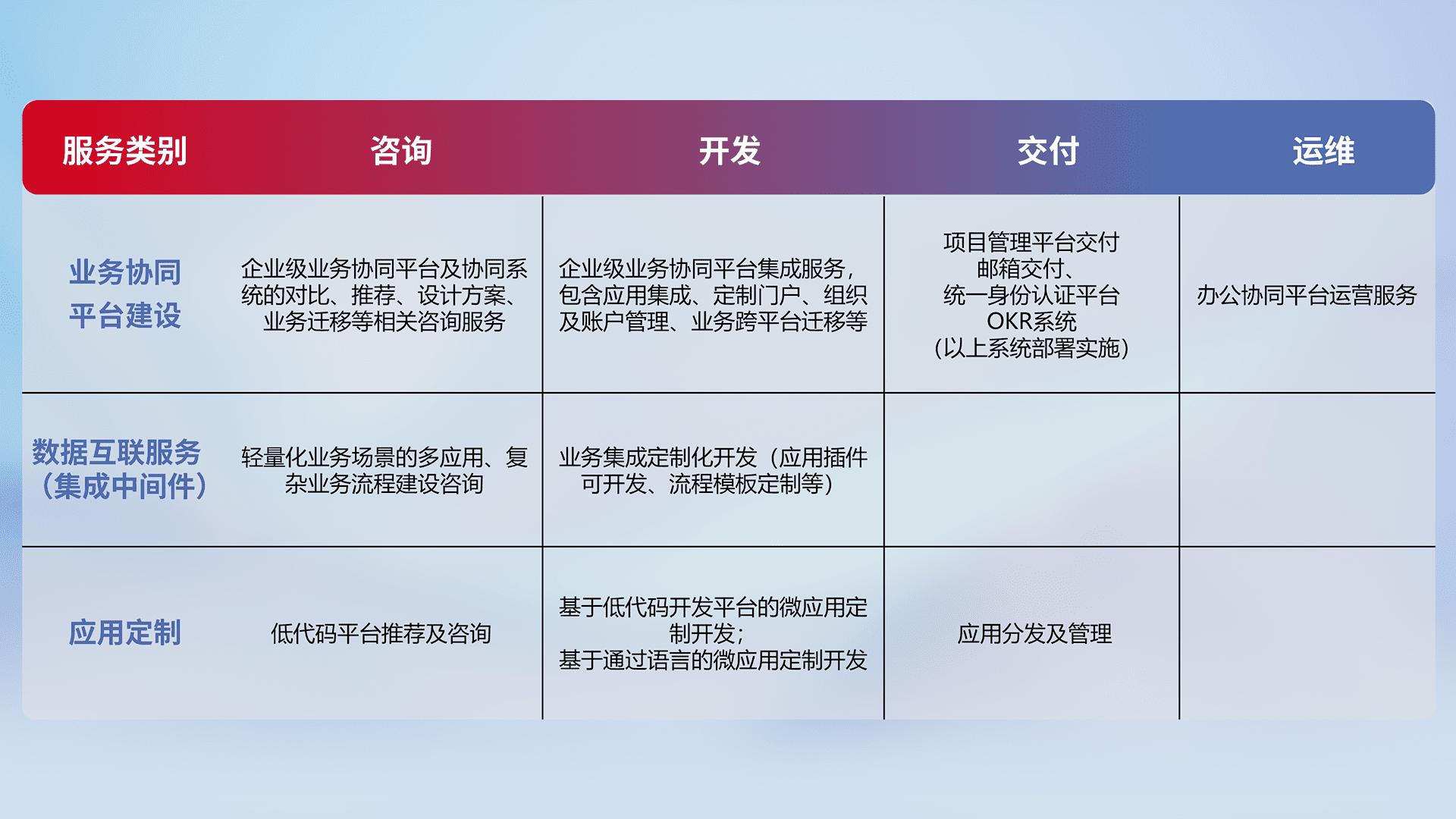 针对钉钉、、、企微、、、IDaas等平台级产品提供产品的规划、、、、方案、、、、交付、、、、定制化开发等服务,,,实现如统一协同办公、、、、智能客户服务、、、、混合会议管理、、、智能数据查询、、、、等业务场景,,,实现数字化转型。。。。